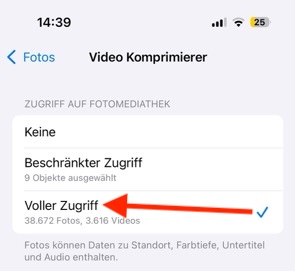 iOS fragt, ob eine App auf alle, nur ausgewählte, oder gar keine Fotos/Videos zugreifen darf.